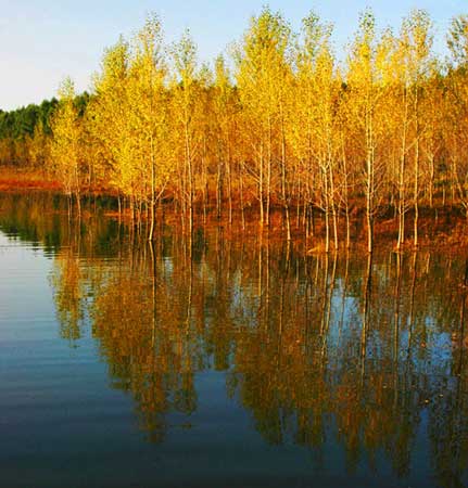 這里,沒有煙塵的污染,沒有汽車的尾氣,有的是新鮮空氣,是這濃綠散發的富含氧氣的新鮮空氣。凈月潭中有9000公頃綠地,按每平方公頃綠地制造600公斤氧氣計,一天就能放出5400000公斤氧氣。它為人們吐故納新提供了多么巨大的幫助啊!假若在這濃綠中擇一處靜坐,練習吐納之法,定會身心如一,經絡暢通,渾身通泰,神完氣足。 松林的地上鋪滿了枯干的松針,躺在松針上,仰面朝天,感受大地的情韻,馳騁的心很快就靜了下來。靜靜地聆聽松濤,心潮隨濤聲洶涌,情思隨濤聲澎湃。唐人李商隱在《高松》詩中云:“高松出眾木,伴我向天涯。客散初晴候,僧來不語時。有風傳雅韻,無雪試幽姿。”被包圍在天籟、地籟、松籟之中,仿佛進入天地人合一的境界。 凈月潭秋季的天空深邃高藍,云如掃、天如洗等特點十分明顯。霜染秋林,色彩紛呈,主要為黃紅綠三色爭勝。黃的如衫,葉多金黃。