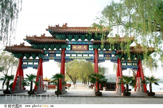 【千秋美景】 大明湖位于濟南市區中心、舊城區北部,與趵突泉、千佛山并稱濟南三名勝。 濟南號稱"泉城",有泉水百余處,其中名泉七十二處。大明湖即是由眾泉匯流而成的天然湖泊。泉水由南岸流入,水滿時從宋代修建于北岸的北水門流出,湖底由不透水的火成巖構成,因而湖水"恒雨不漲,久旱不涸",常年保持較固定的水位。 大明湖在中國北魏時期著名地理學家酈道元(?-527)的《水經注》里便有記述。因景色秀美,古跡眾多,又處于繁華都市之中,千百年來一直是游覽勝地。 ![]() 大明湖南門牌坊 1958年,濟南市人民政府以大明湖為主體建成大明湖風景名勝區。現公園占地86公頃,湖面46公頃,水深平均兩米,有北洋洲、翠柳屏等6座島嶼。岸上花木繁茂,亭臺樓閣掩映其間;水面鳶飛魚躍,游艇畫舫蕩波穿行。大明湖每年接待國內外游客200多萬人次,在濟南諸風景名勝區中居首。