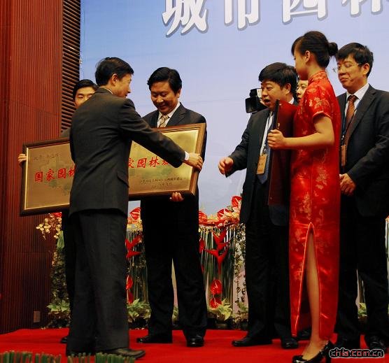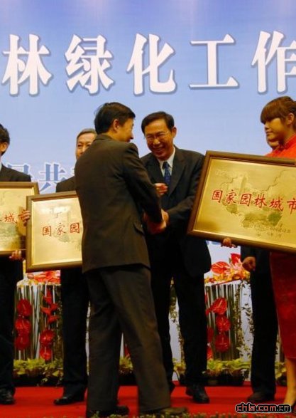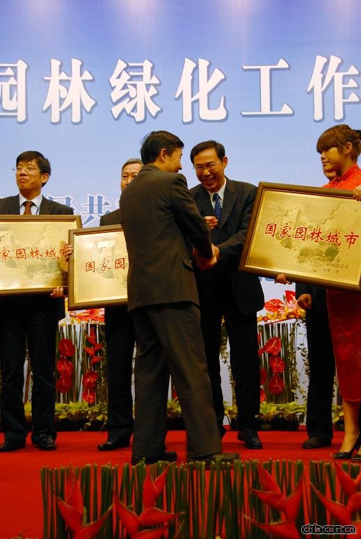 住房和城鄉(xiāng)建設(shè)部副部長(zhǎng)仇保興為園林城市頒牌(圖)