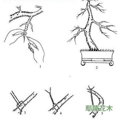 棕絲扎法:棕絲是從棕皮中抽取的一種韌性很強的纖維絲,橡皮生長在棕櫚樹干上,可在成熟的棕櫚樹于上剝取。其拉力、耐磨、耐腐能力均很強,極適宜扎縛樹木的干、枝。自古以來,中國樹木盆景在造型時,均采用棕絲扎縛,此法稱“棕絲扎法”。不同派別的盆景棕絲扎縛的方法都不完全一樣,各自都有自己的一套比較完整的、行之有效的扎縛技法,這種技法稱“棕法“。棕絲扎法第一步先將棕絲捻成棕線,最細的枝條~根棕絲為一根棕線,即用一根棕絲扎縛。較粗的干、枝用兩至多根棕絲捻成的棕線。扎縛時,將棕線的一頭固定在彎子底部(底),又稱下著點。再將兩根棕線來回交叉幾下,然后臺為一股線。將棕線的另一頭系在彎子的頂部(頂),又稱上著力點,打一活結,然后用手將干或枝按預定方向及彎曲的弧度,壓彎至預定的位置,再將棕線收緊,打一死結固定,這樣一個彎曲即完成了。彎予的頂和底就是上下著力點,著力點的位置選定的正確與否是很重要的,因為它決定著彎子的大小(弦的長度),彎子的方向,鴦子的形狀(是自然流暢還是生硬呆板)圾對下一個彎子的影響和在整個畫面中的地位。由于干或枝的粗細(包括同~于或枝的各個部位的粗細)不同,千或技的術質不同。千或枝上著生的節疤的數量、大小、位置不同,這就給扎縛增加了難度。如果要將一株樹木的干或眾多的枝條都壓彎后扎縛,固定到預定的位置上,非要具有熟練的技藝和能自如地運用各種棕法不可。揚派盆景將一個主枝上的各個側枝、細枝扎縛至一個水平面上,應該說是一件很不容易的事情,F代樹木盆景,形式偏向魍由,可采用粗扎細剪的技法制作盆景。即使扎的功夫不到家,仍可采用“細剪”方法來彌補,往往也能收到一定的藝術效果。但是作為一個盆景藝術工作者,仍要經過一個嚴格的訓練過程,如能夠熟練地掌握各種棕絲的扎縛技藝,對素質的提高和創作出更深層次的盆景是有益的。