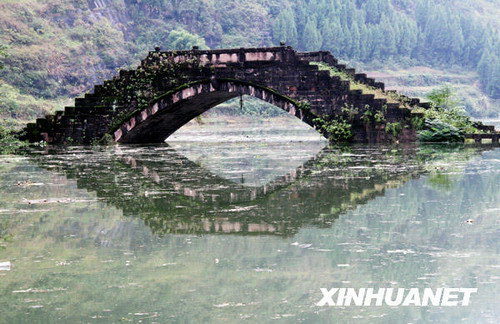 11月2日拍攝的即將沒入水中的述先橋。 隨著三峽工程試驗(yàn)性蓄水繼續(xù)進(jìn)行,位于重慶市云陽縣南溪鎮(zhèn)的述先古橋大部分橋體已沒入水中。始建于1870年的云陽縣述先橋長75米、高14米、寬7.5米,曾是云安鹽業(yè)出川的陸上重要通道。在三峽工程試驗(yàn)性蓄水前,述先橋作為重點(diǎn)文物古跡經(jīng)過反復(fù)論證,最終確定就地加固、防水防蝕修繕入水保護(hù)方案。本次蓄水完成后,述先橋?qū)⑷繘]入水中,今后將隨著三峽工程季節(jié)性防洪水位調(diào)節(jié)而時(shí)隱時(shí)現(xiàn)。本次蓄水是對(duì)橋體承受浸泡力的檢驗(yàn),有關(guān)方面正在密切監(jiān)測(cè)相關(guān)數(shù)據(jù)。