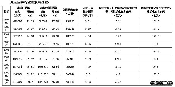 相關鏈接: 2007年我國城市建成區綠地率31.3% 人均公園綠地8.98平方米 中國風景園林網訊 據住房和城鄉建設部綜合財務司新近編制的《2007年中國城市建設統計年鑒》顯示,至2007年末,我國城市建成區綠化覆蓋面積達125萬公頃、建成區綠化覆蓋率35.29%,建成區綠地面積111萬公頃,建成區綠地率31.3%。城市擁有公園綠地面積33.3萬公頃、人均公園綠地8.98平方米。2007年城市市政公用設施建設固定資產投資中園林綠化為525.6億元。2007年城市維護建設資金支出中園林綠化為361.1億元。 到2007年末,我國共有187處國家級風景名勝區。據對其中185處統計,國家級風景名勝區面積為7.6萬平方公里,供游覽面積3.4萬平方公里,全年接待游人量4.1億人次,全國投入11.8億元用于名勝區的建設和維護。 根據對全國22個。ㄅ_灣省除外)、5個自治區、4直轄市的統計,城市建成區綠地率排名前三的有江蘇、江西、上海,其中江蘇省建成區綠地率最高,為38.42%;城市建成區綠化覆蓋率排名前三的有江蘇、海南、江西,其中江蘇省建成區綠化覆蓋率最高,為42.08%;全國人均公園綠地面積排名前三的有山東、江蘇、內蒙古,其中山東省人均公園綠地面積最大,為13.33平方米/人。 其中,江蘇省在城市建成區綠地率和城市建成區綠化覆蓋率兩項指標中都位居第一,2007年其省內建成區園林綠地面積104276公頃,建成區綠化覆蓋面積116157公頃,公園綠地面積29125公頃,公園601個。 見證園林行業的發展過程 2000年以來,隨著人口和經濟的快速發展,我國正處于城市化加速期,人們對環境意識逐漸增強,對生存空間的舒適度要求也越來越高,園林行業也迎來了發展的黃金期,城市建設中對園林綠化的投入在不斷增加。與1999年相比,2007年我國城市建成區綠化覆蓋面積擴大了657875公頃,覆蓋率提高了7.71個百分點;建成區綠地面積增加了614637公頃,綠地率也提高了8.27個百分點;公園綠地面積增加了200724公頃,人均公園綠地面積提高了5.47平方米。 目前,園林綠化已成為現代城市空間的優化者和城市自然空間的締造者,是制約城市環境質量的一項重要建設內容。園林在現代城市化建設中的重要作用和應有地位已經得到我國各級領導和社會公眾的廣泛認同;對園林綠化改善城市生態環境、為居民提供游憩空間、美化市容、創造城市減災避災條件和促進城市可持續發展等,各種重要作用的獲得一致認同,我國風景園林行業的發展空間將越來越大。 ![]() (數據內容參考《2007年中國城市建設統計年鑒》)