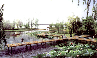 安慶市菱湖風景區市民公園項目設計目標是建設以城市文化公園為主要建設發展方向,兼顧風景區和休閑旅游區的功能,圍繞“皖山、皖水、皖文化”,建設集觀光旅游、休閑度假、娛樂體驗、宗教文化熏陶于一體的全國聞名的皖國“人文山水”體驗型旅游目的地,提升菱湖風景區的整體價值及文化內涵,振興“皖”文化。 擬建市民公園位于菱湖風景區的中心,東面與北面均臨東太湖,西臨城市交通性道路湖心中路(該路將成為其主要入口),南邊與建成的現蓮湖公園北苑接壤。市民公園用地面積34.68萬平方米(含水面5.3萬平方米),地理位置重要。園內有總體規劃中擬建的兩個建筑單體,黃梅戲藝術中心以及培訓學校。設計中對兩個建筑與景觀環境的關系進行了合理調整,還包括重要的文化中心標志建筑選址設計。 上海市園林設計院設計團隊在把握歷史文脈的基礎上突出自然生態特點,使市民公園成為一個有生氣又有文化品位的實體,一個人與自然和諧共存的生態環境,真正成為整個菱湖風景區的核心區域,景區之“源”。 同時高度重視生態意義:通過有機形態設計,采用挖湖清淤的手法,進行河岸線的整治,改變了原先外側水岸的單調。通過水森林及水生植物的過濾系統,將菱湖的水系在小菱湖內得到循環過濾,充分展示生態處理過程,提高水質。 為了把安慶市真正建成皖西南的旅游網絡中心點,設計中加強對市區旅游資源的挖掘和建設,滿足“安慶歷史文化名城——菱湖風景旅游區——大龍山”的城市旅游格局。使菱湖風景旅游區處于真正的旅游核心地位,以綠化景觀為主,形成集觀演、文化、休閑、旅游觀光等為一體的濱水開放性場所,既讓游人休閑娛樂,又讓游人充分感受到文化的氛圍。因而市民公園設計中充分考慮開放性(公益性的休閑功能)、景觀性(建構筑物的地標性》、生態性(園林環境)和經營性(購物、娛樂等)的綜合特征。 安慶,歷史悠久,人文薈萃。2000多年前,這里就建立了古皖國,創造了燦爛的古皖文化。建于南宋時期的安慶城,至今已有800年的歷史。從清朝乾隆二十五年(公元1760年)至1938年,其間170多年,安慶一直是安徽省府所在地,為全省的政治、經濟和文化中心。在設計中選取了桐城派文化、黃梅戲曲文化、佛教文化等安慶文脈主體,發掘皖文化振興主題。 設計的核心目標:以“歷史觀照,人文關懷”的大手法突出中心主題、三條脈絡。通過中心主題:“源、文、盛”,展現皖文化的源流、積淀,歷史的延續、再現與文化的復興;通過佛教文化脈絡、黃梅戲曲文化脈絡、水鄉文化脈絡的有機編織,形成氣韻流動的精神載體。 場地總體設計形式上借用“孔雀東南飛”的寓意。在形態表現上以大手筆的孔雀南飛的形態為主要的水體輪廓,蘊含著自然的靈氣,以圖騰的形式出現,集合天地萬物之靈氣,融為一體。鳳凰性本高潔,飛向枝頭,飛向黃梅登高點。寓意吉祥,象征“浴火重生”的文化復興之意。 細節形式上由古“皖”字為生發根源,利用安慶菱湖風景區發達的水系,以“皖”字婉轉、流動的形式,結合靈動的水岸線,形成一條藝術的河流、文化的河流、歷史進化的河流、佛學的傳承,演出一篇動人的風光山水篇。 在藝術與形式的結合上采陰陽相濟、剛柔結合。吸收、借鑒姚鼎的“義理、考據、辭章及陰陽剛論”及“桐城派”的代表人物方苞先生提出的“桐城派”的文化精髓“義法”。 在市民公園的設計中,充分做到理念與設計手法互相摻揉,相得益彰。做到內容表現形式,重視藝術的體現,“氣”體現氣勢,“神”體現氣之精處,借用文學的創作語言,凸顯景觀的藝術性。同時傳承地方園林和建筑的獨特風格,進行簡約的、神似的“再創造”,并引用中國園林中“通透”和”流動”的處理手法,以收到視野開闊、小中見大的藝術效果。 中國風景園林網獨家稿件聲明:該作品(文字、圖片、圖表、音頻、視頻)特供中國風景園林網使用,未經授權,任何媒體和個人不得全部或部分轉載。 熱點推薦