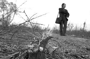 23日上午11時許,海淀區上莊鎮西閘村,村南一片約50畝的農地里,成片的桃樹林被齊根砍斷,斷口處還透著嫩白,地上的腳印也浸著濕氣。據桃樹主人章風山稱,目前至少有2000株被毀。