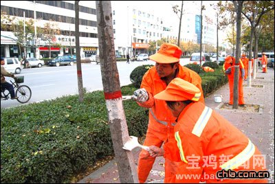 公園路上環衛工人為沿街樹木刷白 近來細心的市民可能會發現,寶雞市區大街小巷路邊的樹木都圍上了整齊劃一的雪白“圍裙”,而路邊的綠地、花壇也變得比往日蔥翠許多,這是我市園林環衛職工在為市區綠化帶草木進行刷白和根灌工作。 11月25日下午,記者在市區公園路上看到,一群環衛工人正手持木刷認真地為沿街樹木逐棵地進行刷白,而離此不遠的路邊花壇處,一位環衛工人正手持水龍頭對著花壇進行澆灌。負責該路段樹木養護的工作人員告訴記者,初冬對樹木進行刷白,不但能預防冬季害蟲為避寒而侵駐樹干,而且能殺死害蟲在樹干里產下的蟲卵。在這個時候對植被進行根灌,一方面是對草木根部水分的補給,另一方面水在地表結冰,能對草木根部起到一定的保溫作用,使花草樹木不至于在過冬時凍壞了根。 環衛工人澆灌街頭花壇 據了解,我市園林環衛局計劃今冬對市區的45000株樹木進行刷白,并根據實際情況進行樹木修剪、冬灌等工作。同時,園林環衛局還將抓住冬季植綠時機,對市區主干道、公園廣場及街頭綠地的喬木、灌木、草坪、地被進行全面補植,為我市創建全國森林城市做好準備。