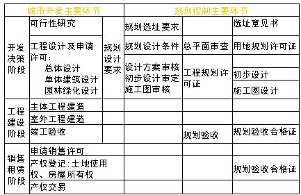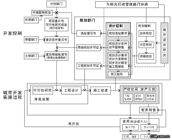 ·工程設計是我國目前城市規劃干預城市開發的核心環節 工程設計階段一般可分為總體設計、單體建筑設計、園林綠化設計、室內環境設計4個層次。 后3層次設計又分為方案設計、初步設計、施工圖設計3個階段。 工程建設階段一般可分為建筑工程建造、園林綠化工程建造、竣工驗收三個環節。建筑工程建造的產品――房屋是市場開發的核心。園林綠化工程建造對公共空間品質有著具體而重要的影響。工程建設須按照規劃批準的工程設計文件施工(其中園林綠化工程建設須按園林部門批準的設計文件施工)。對此,竣工驗收是目前我國規劃、園林干預工程建設的主要環節。 銷售租賃階段可劃分為申請“銷售許可證”、產權登記,產權交易(過戶產權證)。嚴格地說,只有合法取得的產權空間才能在市場上進行銷售和轉讓。也就是說,城市規劃通過提供合法取得“產權空間”的規劃條件(具體就是規劃設計要求)而干預工程建設和房屋銷售兩個階段。因此,規劃部門提供的規劃條件和規劃部門批準的工程設計文件是工程建設階段和房產銷售階段有關“產權空間”方面公共干預的主要法定依據。 但規劃對于房產市場上的核心產品――“房屋產權”則只有微弱的約束力。對此,需要完善相關法規制度以改進規劃控制機制。 1.1.2 城市規劃干預城市開發的法定程序與過程 隨著我國社會主義市場經濟體制的不斷完善,城市規劃成為政府干預城市開發的主要手段之一。根據《城市規劃法》,城市規劃干預城市開發的核心手段是“一書兩證”的設計審批制度。實質是行政審批。通過提供規劃設計條件,并據此審查規劃設計和工程設計,核發“一書兩證”。從控制論角度,這是規劃控制的核心環節。 以國家《城市規劃法》為主干法的規劃法規體系詳細規定了城市規劃制定和實施的程序和要求。建立了一個完善的城市規劃制定、實施管理的法定程序,也就是城市規劃制定和實施以發揮作用的過程(如下圖)。 ![]() 1.1.3 規劃控制 · 規劃控制是城市政府及其城市規劃行政主管部門(控制主體)對城市開發的控制。具體就是通過編制城市規劃確定控制目標和控制內容,并據此對具體開發項目提出具體規劃設計條件(控制方法)且實施監督管理。編制城市規劃、提出規劃條件、實施監督管理這些實際上構成了規劃行政的主要內容。廣義的規劃控制等同于規劃行政。 ·針對具體城市開發的規劃控制,就是提出規劃設計條件并監督實施。具體就是核發“一書兩證”的規劃管理。與城市開發主要環節相對應,“提出規劃設計條件”主要針對“開發決策階段”的工程設計,又可分解為核發“一書兩證”的三個“設計審查”環節(如下表),每個環節分別提出深度不同的規劃設計條件作為核發“一書兩證”的法定技術依據。