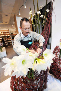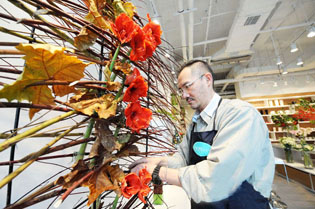 ![]() 11月25日,一名來自香港的花藝師在國貿(mào)橋附近一家花店為顧客準備一件名為“奔流”的大型花藝作品。圣誕節(jié)將至,一些大型鮮花花藝作品在京城悄然流行。