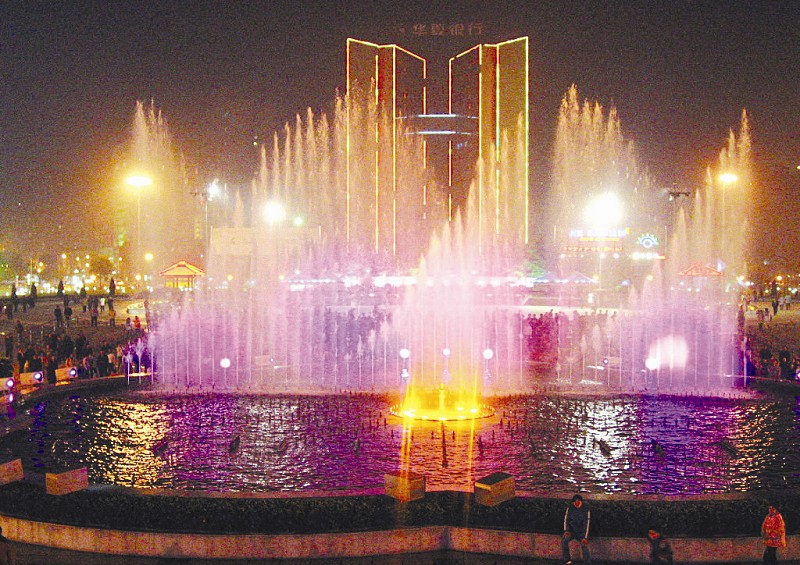 圖為:夜晚的洪山廣場(chǎng),絢麗多彩。音樂(lè)噴泉成為其最大亮點(diǎn)之一 記者萬(wàn)多攝