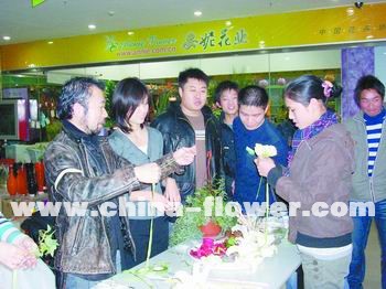 記日本花藝師渡邊俊治北京表演會 12月3日,受北京大自然生活園藝館的邀請,日本知名花藝師渡邊俊治為商戶帶來了一場精彩的花藝表演,主題為婚禮花飾。與其說是表演,不如說是授課,因為從花材的準備,到最后作品的成型,每個細節(jié)渡邊都會熱心講解,讓即使從沒有接觸過花藝的人都能學(xué)做,商戶們受益匪淺。 渡邊共表演了三個作品——瀑布型新娘手捧花、心型新娘手捧花和自然風(fēng)格的花束。瀑布型手捧花的設(shè)計是渡邊的拿手好戲,選用的花材有百合、常春藤、玫瑰等。先是剪下花頭用細軟的鐵絲穿過花柄做成“花莖”,再將吸水棉纏在花柄與鐵絲的接口處,然后纏上綠色膠帶,這是渡邊設(shè)計手捧花的準備工作三部曲。“有這種細軟的鐵絲、吸水棉、膠帶,就能將各種花材設(shè)計成形狀各異、千變?nèi)f化的花束。”渡邊說。 記者看到,經(jīng)過準備后的花材,因為“花莖”柔軟,在制作時花藝師可以隨意調(diào)整角度,非常方便。他表演的第二個作品——心型的新娘手捧花,也是采用相同的方法。渡邊邊表演,邊給觀眾講解,每個細節(jié)都不放過。比如,纏膠帶時不要太緊,否則吸水棉的水會溢出不能起到保濕的效果。 渡邊還說,這種方法不僅能應(yīng)用于新娘的手捧花上,就連普通的商業(yè)花禮也一樣適用。渡邊將他出版的作品集展示給記者,這些用相同花藝手法制作的作品,有的擱在玻璃器皿中,有的掛在墻上,色彩、花型千變?nèi)f化,非常漂亮。 在表演之前,渡邊先逛了北京的幾家花市,發(fā)現(xiàn)其花禮制作都有一個共同的特點,即都是半圓球形的花束、花籃,各種花材大都均勻分布,然后再在外面套上多層包裝紙。這與日本流行的自然風(fēng)格迥然不同。渡邊表演的第三個作品,體現(xiàn)的就是日本目前最崇尚的自然花藝風(fēng)格。他選用的花材有菊花、玫瑰、紅朱蕉葉等,這些花材被隨意地組合在一起,非常自然,有些花頭甚至還猶抱琵琶半遮面地縮在花束里面。花束沒有使用一張包裝紙,綁扎用的也是自然的草筋。渡邊說:“一株菊花,有的開在上面,有的藏在里面,不可能都是均勻的,自然風(fēng)格就是要盡量地表現(xiàn)出植物自然生長的態(tài)勢。”渡邊還說,這種花束既可以作為新娘手捧花,也可以為探視病人和走親訪友之用。