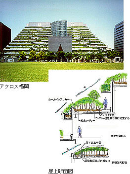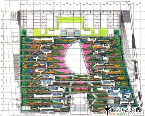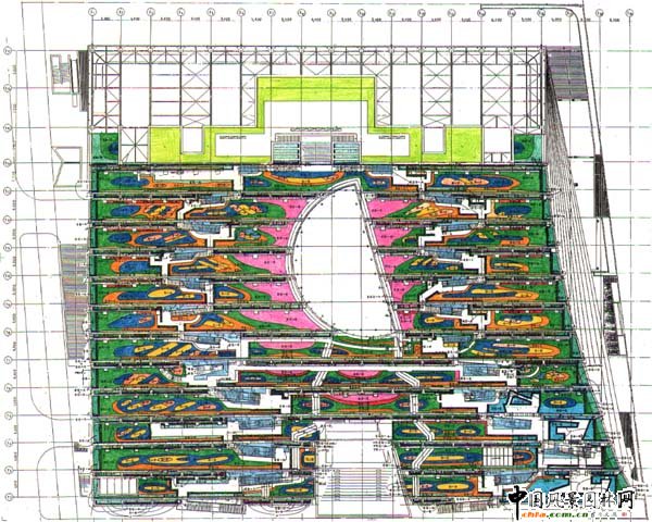 2 技術試驗調查 施工之前,對人工土壤的性能、排水系統、灌溉系統、樹木支柱保護、景觀、臺階花園的管理等進行了預備試驗,建成后, 還進行了人工降雨試驗。在經歷多次的臺風危害以及1994年夏季大干旱后,植物依然生長茂盛,是日本屋頂花園技術的成功展示和優秀范例。 對土壤的比重、經年變化、保水性能、排水性能、耐風性能(支柱、防止飛散)、管理、施工等項目進行了綜合試驗后,選擇了質輕、保溫與保水性優良的人工土壤。屋頂的雨水通過土壤滲透到下一層臺階,最終到達地面而被排掉。 另外,臺階狀屋頂花園建成后,沒有進行過人工灌溉。現已達到了近于無灌水、無農藥、無肥料的生態型管理要求。 ![]() 植物配置圖 3 施工過程 (1)鋪設耐壓透水通氣板 對于人工栽植基盤的綠化來講,排水與通氣是最重要的條件。在長期土壤干燥的情況下,可以通過灌溉來解決,但土壤過濕會對植物的生長造成危害。土壤的排水性與通透性具有直接的關系。所以,鋪設耐壓透水通氣板是屋頂花園施工時最主要的作業之一,同時,該層也具有一定的防止植物根系穿透的作用。