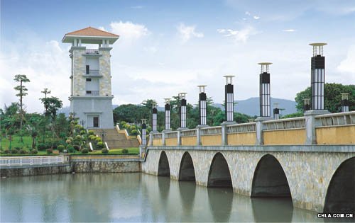 ——東莞市嶺南園林建設有限公司 黃江人民公園是集游覽、娛樂、健身、休憩功能為一體的大型綜合性公園,園區結合當地人文特色和地貌現狀,以東南亞風情園林景觀為理念,運用現代造園手法,把棕櫚科植物、榕屬植物、開花灌木及疏林草坪與開敞的人工湖、輕巧通透的熱帶園林建筑合理搭配,形成具有強烈亞熱帶自然風光特色的游憩空間,湖光漣漪,亭臺秀麗,環境幽雅,令人流連忘返。 項目面積:133400㎡ 竣工時間:2003年11月 ![]()