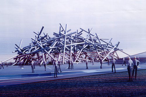 合肥國際科技創(chuàng)新展示館的開工現(xiàn)場(chǎng) 當(dāng)日,合肥國際科技創(chuàng)新展示館正式破土動(dòng)工,展示館主體建筑的平面是一個(gè)不規(guī)則的六角形,整個(gè)設(shè)計(jì)創(chuàng)意來自民間兒童游戲棒,由長(zhǎng)短不一的金屬桿件,按照嚴(yán)格的結(jié)構(gòu)邏輯等級(jí)編織而成,形成亂向自由分布的交叉桿棚罩,外觀酷似樹枝搭積的“鳥巢”。