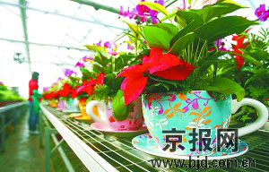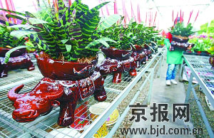 19日,筆者在南四環花鄉花木集團的花卉展廳看到,牛形的、魚形的、杯子形狀的新式花盆成了今年年宵花熱銷的賣點,一改往年年宵花在花盆的設計上的單一。