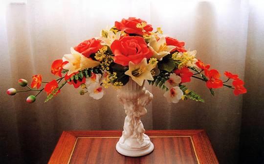 所用花材是人工仿制的各種植物材料,包括絹花、滌綸花等,有仿真性的,也有隨意設計和著色的,種類繁多。人造花多色彩艷麗,變化豐富,易于造型,便于清潔,可較長時間擺放。