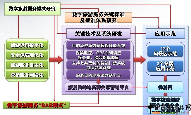 2006年啟動了"十一五科技攻關項目--現代服務業共性技術支撐體系與應用示范工程",其中課題"數字旅游服務示范工程"是對風景名勝區"十五""數字景區示范工程"研究示范的延伸拓展。在24個國家重點風景名勝區數字化建設試點中選取12個景區,納入數字旅游示范景區建設。在繼續推進景區數字化建設專項技術研發的同時,強化研究技術的整合。