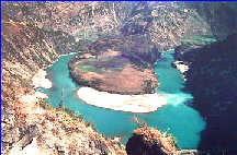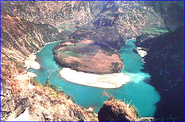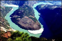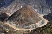 右圖:迪慶德欽縣奔子欄鄉境內平靜舒緩的金沙江拐彎處