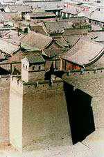 鳥瞰平遙古城,更令人稱奇道絕。這個呈平面方形的城墻,形如龜狀,城門六座,南北各一,東西各二。城池南門為龜頭,門外兩眼水井象征龜?shù)碾p目。北城門為龜尾,是全城的最低處,城內(nèi)所有積水都要經(jīng)此流出。城池東西四座甕城,雙雙相對,上西門、下西門、上東門的甕城城門均向南開,形似龜爪前伸,唯下東門甕城的外城門徑直向東開,據(jù)說是造城時(shí)恐怕烏龜爬走,將其左腿拉直,拴在距城二十里的麓臺上。這個看似虛妄的傳說,閃射出古人對烏龜?shù)臉O其崇拜之情。烏龜乃長生之物,在古人心目中自然如同神靈一樣圣潔。它凝示著希冀借龜神之力,使平遙古城堅(jiān)如磐石,金湯永固,安然無恙,永世長存的深刻含義。 城墻上還有72個觀敵樓,墻頂外側(cè)有垛口3千個,傳說它是孔子3千弟子、72賢人的象征。