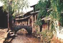 依山就水的麗江大研鎮,既無高大圍城,也無軒敞大道,但它古樸如畫,處處透出自然和諧。鎮內屋宇因地勢和流水錯落起伏,人們以木石與泥土構筑起美觀適用的住宅,融入了漢、白、藏民居的傳統,形成獨特風格。當地常見的是“三坊一照壁”式民宅,即主房、廂房與壁圍成的三合院。每房三間兩層,朝南的正房供長輩居住,東西廂房一般由下輩住用。房屋多在兩面山墻伸出的檐下,裝飾一塊魚形或狀木片,名曰“懸魚”,以祈“吉慶有余”。許多庭院門樓雕飾精巧,院內以卵石、瓦片、花磚鋪地面,正面堂屋一般有六扇格子門窗,窗心的雕刻大多是四季花卉或吉祥鳥獸。堂前廊檐大多比較寬,是一處溫馨愜意的活動空間。