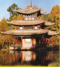 4、福國寺五鳳樓  五鳳樓(原名法云間),位于黑龍潭公園北端,始建于明萬歷二十九年(公元1601年),1983年被公布為云南省重點文物保護單位。樓高20米,為層甍三重擔結構,基呈亞字形,樓臺三疊,屋擔八角,三層共24個飛檐,就象五只彩鳳展翅來儀,故名五鳳樓。全樓共有32棵柱子落地,其中四棵中柱各高12米,柱上部分用斗架手法建成,樓尖貼金實頂。天花板上繪有太極圖、飛天神王、龍鳳呈祥等圖案,線條流暢,色彩絢麗,具有漢、藏、納西等民族的建筑藝術風格,是中國古代建筑中稀世珍寶和典型范例。
