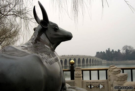 16、銅牛:銅牛在昆明湖東岸,十七孔橋東橋頭北側。1755年用銅鑄造,稱為“金牛”。銅牛是為鎮壓水患而設。