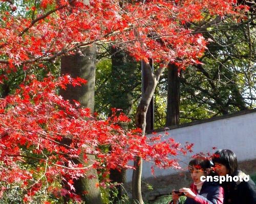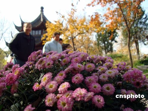 12月5日,游人在蘇州拙政園游玩。眼下,寒氣逼人的古城蘇州古典園林拙政園里,楓飄紅,菊花含香,銀杏樹葉泛黃,呈現一派賞心悅目的迷人“秋景”,讓游客陶醉其中。