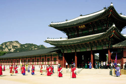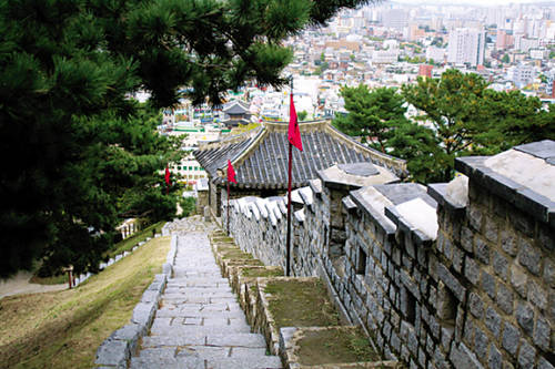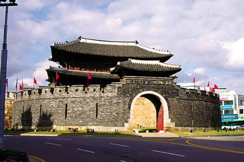 水原華城是朝鮮正祖大王為移葬其父王到這座被稱為朝鮮最好風水寶地的水原華山,于1794年修建了水原華城。它由近6公里長的城墻圍成一圈,一側是平原,一側依山而建,像中國的長城順山勢而起伏,既實用亦具較高的審美價值。城內除建有華城行宮建筑群外,至今還原封不動地保持著200年前城市的主要骨架。水原華城有四座門樓和兩個水門,還有多處炮臺、將臺、角樓等構成一個依山勢高低錯落的立體整體,登上山上點將臺俯瞰,更覺氣勢不凡。1997年它被列入世界文化遺產。