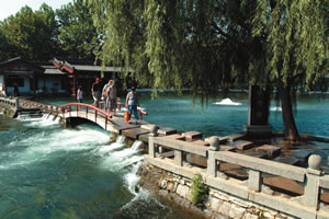 龍泉寺,雄踞在百脈泉北岸,為濟南地區著名佛寺。始建于景泰元年(1450年),原名隆泉寺,嘉靖年間重修后,易名龍泉寺。由于歷史的風剝雨蝕,配殿早已廢圯,現僅存大殿梵王宮。經1996年重修改造,面貌煥然一新。殿內,佛像金碧輝煌,壁畫形象生動,是善男信女禮佛參禪的所在。佇立梵王宮前,云蒸霞蔚的湖光山色盡收眼底,如在瀟湘仙境,使人神致飛動。殿下之百脈泉,由品形并列的三大方池組成,中架石橋相通。池內,百脈沸騰,出神入化;涌珠浮翠,透泄天真,堪稱天下奇觀。歷代文化名人在她身邊流連忘返,酣暢吟詠。留下了許多佳詞麗句,精美石刻。讓游客在觀泉的同時得到一種文化享受。 清照園,位于百脈泉公園西北角,為紀念絕代詞女李清照而興建,這是一座集中國南北園林風格于一體的園中之園,園內設有李清照紀念館,1997年5月建成開放。園門外,東側豎有復原的李格非《廉先生序》碑,這是李清照原籍明水的鐵證。西側聳立著由當代著名書法家舒同題寫的“一代詞宗”石碑。園門正中懸掛著著名書法家康殷題寫的匾額“清照園”。二門廳榭下豎立著由著名雕塑大師錢紹武親手雕制的李清照塑像,形象逼真,栩栩如生。這位曠世才女,緊蹙雙眉,昂然遠矚的英姿,令前來瞻仰的游客油然而生憂患之情,愛國之思。清照園仍以泉水 為主題,園內1500平方米的水面由漱玉泉、梅花泉匯合而成。