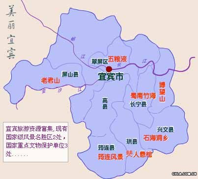 地理環(huán)境 宜賓位于四川盆地南部,是川、滇、黔三省交匯地。東靠萬里長江,西接大小涼山,南近滇、黔,北連川中腹地,素為川南形勝。自古以來,宜賓就是川南、滇東北和黔西北一帶重要的物資集散地和交通要沖。 宜賓全區(qū)地跨東經(jīng)103°36′-105°20′,北緯27°50′-29°16′之間。東西最大橫距153.2千米,南北最大縱距150.4千米。市境東臨四川瀘州市,南接云南昭通市,西界樂山市和涼山彝族自治州,北靠自貢市。 在漫長的歷史進程中,宜賓形成了具有本地區(qū)古老民族文化特色的僰文化、酒文化、竹文化、茶文化及獨特的川南民俗風情等,產(chǎn)生了誘人的魅力和影響。 地形地貌 宜賓地形整體呈西南高、東北低態(tài)勢。市境最高點為海拔2008.7米的屏山縣五指山主峰老君山,最低點為海拔236米的江安縣金山寺附近,全市地貌以中低山地和丘陵為主,嶺谷相間,自然概貌為"七山一水二分田"。市境內(nèi)海拔500-2000米的中低山地占46.6%,丘陵占45.3%,平壩占8.1%。 氣候 宜賓屬亞熱帶季風性濕潤氣候。四季分明,春秋較長。雨水豐沛,多在夏季,較長的降水過程都發(fā)生在6~7月份,雨熱同季,全年積溫較高,無霜期較長,多年平均溫度17.5℃,年均降水量1070.4毫米,年均日照時數(shù)976.2小時,無霜期270天,夏無酷暑,冬無嚴寒,氣候溫和,是得天獨厚的柑桔生產(chǎn)基地。 土壤植被 宜賓全市土壤總面積107.33萬公傾,占全市土地總面積的80.5%。全市土壤有紫色土、水稻土、黃壤、黃色石灰土及黃棕壤、新積土等六大類。市境內(nèi)植被除屏山縣老君山、興文縣仙峰山、筠連縣大雪山等地的原始植被外,絕大部分為原始植被受破壞后的次生植被與人工植被。境內(nèi)亞熱帶次生性常綠針葉林植被分布較廣,竹林為一大特色。2004年全市森林覆蓋率37%,綠化覆蓋率45.6%。 水系 宜賓境內(nèi)水系屬外流水系,以長江為主脈,河流多、密度大、水量豐富。 金沙江、岷江、長江橫貫市境北部,三江支流共有大小溪河600多條。南廣河、長寧河、橫江河、西寧河、黃沙河、越溪河、箭板河、宋江河、古宋河等9條中等河流流域面積均在500平方千米以上。另有21條河流流域面積為100平方千米~500平方千米,有23條小河流域面積為50平方千米~100平方千米。三江的支流、溪河或由北向南,或由南向北作不對稱的南多北少狀河網(wǎng)分布,南部支流多發(fā)源于崇山峻嶺,故灘多水急;北部支流多發(fā)源流經(jīng)丘陵,故水勢平緩,岸勢開闊。 主要河流:岷江、南廣河、長寧河、橫江河、西寧河、黃沙河、越溪河、箭板河等。