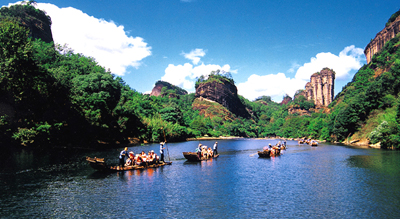 武夷山市位于福建省西北部、閩贛兩省交界處,介于東經117°37′22″—118°19′44″、北緯27°27′31″—28°04′49″之間,屬中亞熱帶地區。前身為崇安縣,建置于北宋淳化五年(公元994年),1989年8月經國務院批準撤縣建市,是一個以名山命名的新興旅游城市。 武夷山風景秀麗,歷史悠久,人文薈萃,素有“碧水丹山”之譽。全市土地總面積2798平方公里,總人口22萬人,轄3鎮、4鄉、3個街道、5個國有農茶場、115個行政村,境內擁有首批國家重點自然保護區、國家風景名勝區、國家旅游度假區、國家一類航空口岸、全國第4批重點文物保護單位--城村古閩越王城遺址。1998年7月,被評為中國首批優秀旅游城市; 1999年12月,被聯合國教科文組織批準列入《世界遺產名錄》,成為我國第4處,世界23處世界文化與自然“雙遺產”地之一。2000年,被評為全國首批4A級旅游區,2002年被列入中華十大名山。 主要特點有以下六個方面: ——武夷山具有獨特、稀有、絕妙的自然景觀,屬罕見的自然美地帶,是人類與自然環境和諧統一的代表。武夷山自然風光獨樹一幟。1982年11月國務院批準設立武夷山國家重點風景名勝區,總面積70平方公里。武夷山景區是典型的丹霞地貌,區內一條幽深清澈的九曲溪盤環山中,兩岸丹崖林立,千姿百態,九曲溪兩岸分布著36奇峰、99巖,昂首向東,如萬馬奔騰,氣勢雄偉,千姿百態。山不高有高山之氣魄,水不深集水景之大成。浮光山色中又散落著眾多的古文化遺存,將人的思想、人的情感、人的智慧、人的勞動融于自然山水之間,達到天人合一的境界,給人以渾然天成的和諧美感。1990年原世界旅游組織執委會主席巴爾科夫人在游覽武夷山后欣然題詞:“未受污染的武夷山風景區是世界環境保護的典范。”