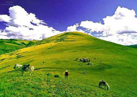 行進在山林草原溪流間,隨時能看到成群結隊的猴子、盤羊、獐子、鹿子、白馬雞、藏雪雞等野生動物。有牧人天籟般的歌聲從山那邊飄來,循歌聲望去,有羊群在如茵的草地上悠然移動。這般詩情畫意的景物最是動人。站在“鐵匠山”埡口,遠眺格聶神山,一長列高聳入云的雪山,如橫空出世,氣勢恢宏,她超凡入勝的氣度直撼人心,使朝圣者匍匐跪拜。