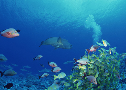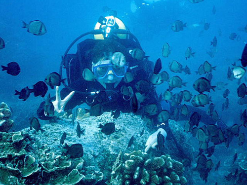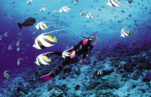 在蜈支洲島,即使你并不潛水,而只是沿著沙灘漫步,也能夠看見許多碎的珊瑚和貝殼,它們被海浪沖到沙灘上。如果挽起褲腿往深水里走,還能看見各種顏色的珊瑚,漂亮極了。隨手翻起一塊礁石,經(jīng)常會發(fā)現(xiàn)無數(shù)的海膽和一些叫不出名字的軟體動物在爬行。遠(yuǎn)處,飛魚在海上翩飛,如白箭閃過,讓人產(chǎn)生幻覺。 潛水踏浪莫忘運(yùn)動 蜈支洲島環(huán)島海域水清見底,能見度極高。盛產(chǎn)夜光螺、海參、龍蝦、馬鮫魚、海膽、鯧魚及五顏六色的熱帶魚。南部水域海底珊瑚礁保護(hù)很好,五彩斑斕,形態(tài)奇異。這里是海上娛樂特別是潛水觀光的首選之地。 在蜈之洲島潛水采用“船潛”的方法,游客最好是接受過簡單的潛水訓(xùn)練,或曾經(jīng)參加過南海體驗(yàn)潛水及亞龍灣的潛水活動。蜈之洲島珊瑚的保護(hù)完美程度是三亞之最,硬珊瑚、軟珊瑚層層疊疊,顏色絢麗多彩,珊瑚魚種類繁多,是真正的潛水中的精品。五彩斑斕海洋生物會令你眼前一亮,而好多沒有見過的海生物也會讓游客蠢蠢欲動,迫不及待想投入海洋懷抱一探究竟。