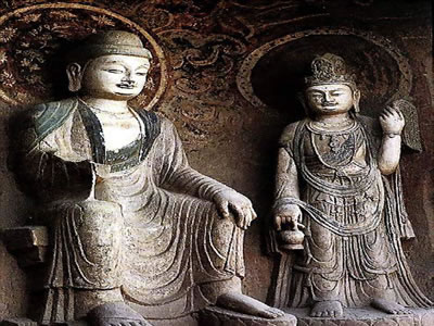 大云洞居于千佛崖中心位置,規模最大,共計造像234 尊, 左右兩壁雕有148 尊蓮花觀音像,窟正中一大佛立像為彌勒佛。 據說該尊彌勒佛是武則天的化身像。唐天授元年(690 年),武 則天正式登基時,白馬寺法明和尚薛懷義等12名和尚為迎合武則 天當皇帝的需要,撰寫《大云經》呈武則天!洞笤平洝分蟹Q武 則天是彌勒佛降生,應代替李唐做皇帝。武則天看后大喜,親筆 作序,頒布于天下,且令各州要營造大云寺,以珍藏《大云經》。 因武則天生于利州,當地百姓就在千佛崖造大云洞,并且刻了這 尊彌勒佛立像和后壁龕中二圣——高宗李治、武則天。按中國傳 統應男左女右,而該二圣的排列是女左男右,佛龕男高女低,這體現出設計者的巧妙構思。