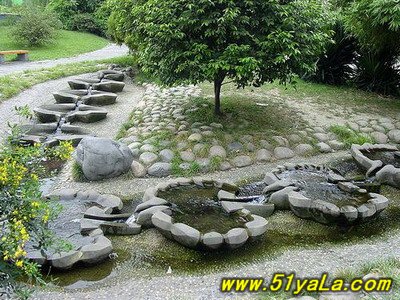 這一段河堤,像梯田一層層鋪展到府水之濱,一縷縷碧草從“田”里的石縫間頑強(qiáng)地探出頭來,織成一幅幅流青溢翠的“井”字地毯。這面山坡上郁郁蔥蔥有綠樹有紅花更有一片密麻麻比人還高的冷蕨苗,還有那咿咿呀呀悠然轉(zhuǎn)動(dòng)的水車,仿佛一下子把人帶到那原始古樸的年代……取自府河水,依次流經(jīng)厭氧池、流水雕塑、兼氧池、植物塘、植物床、養(yǎng)魚塘等水凈化系統(tǒng),或涓涓細(xì)流,或激情跌宕,變幻出多姿多彩,并發(fā)生質(zhì)的變化,向人們演示了水與自然界由“濁”變“清”、由“死”變“活”的生命過程。