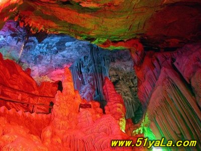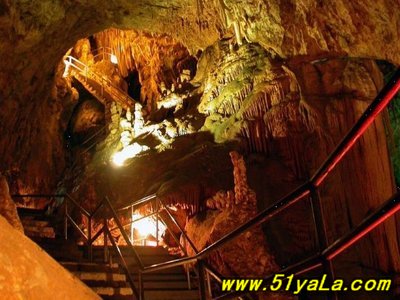 全洞從上至下共分三層,第一層從“佛手迎客”至“南天門”。此層涼風(fēng)習(xí)習(xí),沁人心脾,滌蕩塵心。步入此層,迎面便是一只巨大佛手從洞頂伸出,歡迎你的到來。接著便是“三心堂”,所為三心及天心、地心、人心。還有“圣燈”、“金猴撈月”、“菩蒂樹”、“鯉躍觀柳”等栩栩如生的景點。行至前方,左有園盤皎陽,右有彎鉤銀月,名曰“日月門”。過此門沿石階面下,道旁有頭戴銀盔、身披鎧的“巨靈神”把守仙境要道。右方大廳石壁上一條巨蛇從洞內(nèi)伸頭欲奔,一只大龜頭頸長伸,狀若賽跑,對面石壁上老壽星美鬢長飄、笑容可掬觀看比賽,人們稱之為“龜蛇奔天門”。要道左方可觀看到:“雄獅騰空”、“千佛巖”、“達摩廊壁”、“靈芝山”、“神鷹回首”、“玉杯”、“金山、銀山”、“鋸臺”、“天橋”等惟妙惟肖的鐘乳石造型,恰似一幅璀燦奪目的藝術(shù)浮雕。