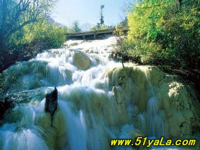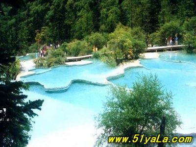從山麓上行,在7.5公里的溝谷中,星羅棋布著3400多個秀麗晶瑩、五色斑斕的彩池,面積最大的不足一畝,最小的僅一平方米左右;深者一丈有余,淺者三寸而已;乳黃色池岸迂回蜿蜒,互相連環。最富魅力的是池水的顏色:有的蕩紅漾綠,潑墨濡黃;有的似藍非白,綠中帶紫,紫中泛青;也有全池一色,如碧玉、瑪瑙、翡翠、象牙各陳艷麗。池與池間,雖活水同源而水色各異,若上池色淡黃,注入下池則為檸檬色;左池是紫紅,注入右池又變為橄欖綠了。流壑飛泉到處可見,像水晶簾掛在鐘乳巖上,垂下千條銀絲,萬串明珠;也有一脈數流,似輕紗般隨風飄拂。 這里有草木蔥蘢、翠柏蒼松如疊嶂的“仙人道”和以“接仙”、“迎仙”命名的溪橋。名貴稀有的雪茶、雪蓮花開遍山野;大熊貓、貝母雞、雪雞等珍稀動物遨游其間。 充滿神奇色彩的黃龍洞更為引人入勝,傳說此洞是黃龍化身黃龍真人修煉成道之所。洞在后寺左前方十余公尺處,洞口有一株雪松,被一叢娑羅花掩映著。洞內掛著許多銀白色乳簾,微風吹過,叮鐺作響。洞頂有一條白龍,張牙舞爪,勢欲騰空飛去。進洞十余米處有三尊佛像和石床、石桌、石凳等物,佛前頂上,吊著一盞盞雪白的“寶蓮燈”。這并非人工鑿成,而是巖溶風化多年自然形成。洞壁上顯現出各式紋樣,有的如行云流水,有的像駿馬奔馳,有的似梅花怒放,有的又若海底水族,真是巧奪天工的天然圖畫。暗河在洞里發出的嘩嘩水聲,更增添了神秘的氣氛。歷代文人墨客在此留下了許多珍貴的詩題。其中有一聯,可作黃龍寺風景的概括描寫:“玉障參天一徑蒼松迎白雪,金沙鋪地千層碧水走黃龍”。