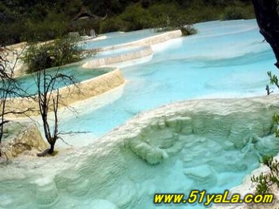 黃龍寺的景色,出于天然,堪稱奇絕。后寺背倚玉翠雪峰。高出云表,猶如白玉屏障,拱衛著整個黃龍。從后寺到谷口,鋪滿了乳黃色的碳酸鈣質,宛如一條從雪山飛騰而下的黃龍。龍頭、龍腰、龍尾處分別建立前寺、中寺、后寺三座廟宇。五色彩池層層相連,恰似龍身上的片片鱗甲,閃閃發光。奇花異草與參天古木遍山中,千層碧水漫流其上。