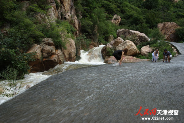 連日來,"后花園"薊縣連續降雨,被譽為"津門第一山"的八仙山呈現出無數的水潭和瀑布,引來無數游人踏水嬉戲。 薊縣的八仙山保護區是一座"生態水庫"。大面積郁郁蔥蔥的森林,造就了獨特的森林氣候,"云從林中起,雨靠林降落"是對這種森林氣候的形象描述。據了解,這里每年向本市有"大水缸"之稱的于橋水庫輸送優質淡水達3.1億立方米。 水是八仙山自然保護區的一大奇觀。今夏以來,天公作美,連續下了幾場雨,豐沛的雨水滋潤,匯成了幾十個清澈的潭水和瀑布景觀。水流湍急、洶涌澎湃,山光水景,相映成趣,吸引了許多游客來踏水尋源。在鱷魚潭、玉龍潭等主要觀水景點,到處都能看見興高采烈拍照留念的游客。