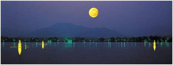 杭州湖面秋水印月 杭州西湖之美,乃世人皆知。中秋月明之夜,泛舟湖上,盡可領略“煙籠秋水月籠紗”的詩般意境。 三潭印月是西湖三島之一,也是自古以來的賞月勝地。三個石塔,亭亭玉立在波光瀲滟的湖面上。每逢月夜,特別是中秋佳節,在塔里點上燈燭,洞口蒙上薄紙,燈光從中透出,宛如一個個小月亮,倒影湖中。待到皓月中天,月光、燈光、湖光交相輝映,月影、塔影、云影融成一片“一湖金水欲溶秋”的景象。