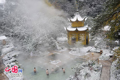 冬游黃山,沐“天下名泉”。姚育青攝 沐養(yǎng)生溫泉 霰雪無垠,矜肅之慮深。冬之韻在泉之章中流淌。嬉后冬雪,沐黃山溫泉,不僅僅是自然的養(yǎng)生體驗,還蘊含黃山的人文關(guān)懷。閉目養(yǎng)神,仔細聆聽,更可以發(fā)現(xiàn)蘊藏其中的美妙音符。或許,這才是冬雪中最動人的那段回味。 “嵩陽若與黃山并,猶欠靈砂一道泉。”黃山溫泉水主要特點是常溫42℃左右,可飲可浴可祛病,是富含重碳酸鹽的淡溫泉,不含有害物質(zhì),可以泡茶釀酒,并對皮膚、關(guān)節(jié)和神經(jīng)方面的疾病有較高的醫(yī)療價值。1979年7月鄧小平視察黃山時,欣然題詞:“天下名泉”。