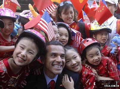 兩屆奧運(yùn)會(huì)舉辦城市洛杉磯的市長(zhǎng)維拉萊戈沙,為游行畫龍點(diǎn)睛后上前擁抱感謝北京奧運(yùn)小天使們,沒想到被小丫頭親吻三次而開懷大笑,不禁讓中國(guó)駐洛杉磯總領(lǐng)事鐘建華和北京市政府王云峰副秘書長(zhǎng)鼓掌喝彩。