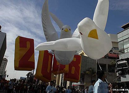 美國(guó)好萊塢星光大道上滿是北京奧運(yùn)風(fēng)情花車隊(duì)伍滾滾而來,巨型和平鴿汽球呼應(yīng)2008奧運(yùn)會(huì)。