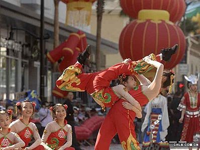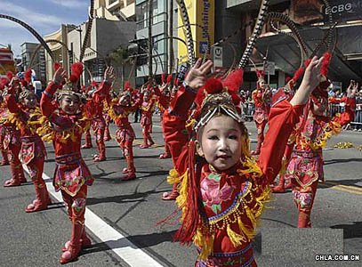 只見京城時(shí)裝美眉開道,北京福娃與金童玉女拜年賀喜,奧運(yùn)精靈和小穆桂英們起舞翩翩,農(nóng)民敲響太平鼓踩高蹺,京劇豬八戒揮動(dòng)中美國(guó)旗......兩旁各族裔民眾夾道歡迎,連扮演神話俠客的街頭藝術(shù)家都豎起大拇指高:“我想去北京!”