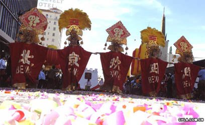 來自中國(guó)首都的精彩隊(duì)伍從好萊塢中國(guó)劇院前啟程,沿星光大道慶祝北京2008年8月8日舉辦奧運(yùn)會(huì)。