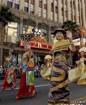 美國(guó)好萊塢星光大道舉行北京奧運(yùn)風(fēng)情花車大游行,北京幼兒園的小穆桂英們贏得陣陣喝彩。