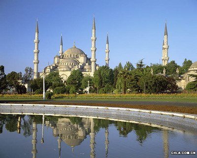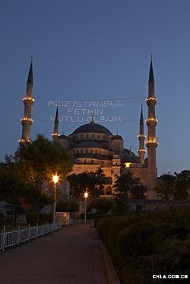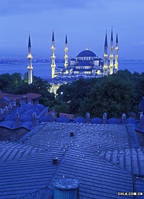 奧斯曼王朝的絕美建筑藍色清真寺位于被列為世界文化遺產(chǎn)的土耳其伊斯坦堡舊城區(qū)中,它建于十七世紀初土耳其奧斯曼帝國最強盛時期,“藍色清真寺”的得名來自其內(nèi)壁以兩萬多塊藍色調(diào)的彩釉瓷磚嵌飾,透過正中央圓頂?shù)膬砂倭却皯舻年柟庹丈?金藍交燦,美得令人屏息。 藍色清真寺的外觀也是一大奇景,它是伊斯坦堡最大的圓頂建筑,三十多座圓頂層層升高,向直徑達四十一公尺的中央圓頂聚攏,龐大而優(yōu)雅。除此,藍色清真寺有一個世界之最,它的四周建有六座“宣禮塔”,是全世界唯一擁有六座高塔的清真寺,塔分三層,樸實無華,但夜晚在燈光的照映下,顯得旖旎萬分。 1609年,14歲即位的阿赫邁特蘇丹命令建筑師邁赫邁特·阿加(MehmetAga)在原來的阿伊舍蘇丹的王宮上修建一座能與阿亞索菲亞教堂相比美的清真寺,以證明他是一個虔誠的伊斯蘭教信徒。1617年,清真寺完工。它是奧斯曼帝國時代建筑和藝術(shù)的輝煌杰作。 從空中往下看,清真寺被包圍在一片蔥蘢的樹木中,6個高高聳立的尖塔分三排對稱地立于長方形寺院的四角和中腰,主殿上是層次分明、大小不一的大圓頂,后院則是大小和形狀都一樣的小圓頂。白色的建筑與綠色的樹林構(gòu)成了一幅十分美麗的圖案。 寺院共有8個入口,分布于寬闊的院子的三個方位,使人們從其中的任一個方位都可以進入。走過門框均由大理石鋪成的三道門,便進到內(nèi)庭,里面粉紅礫石、大理石或斑巖的大石柱之間以拱門相連接,拱頂著30個圓頂。用于洗禮的噴水池占據(jù)了內(nèi)庭的中心,四周是6根大理石石柱。中央圓頂通過角穹靠在4個突出的拱上,角穹則依次倚托在4個直徑1.6米的、巨大的、圓型的、有凹槽的角柱上,4個半圓頂各占中央圓頂?shù)囊环?各個角邊的小圓頂則構(gòu)成了清真寺的底座。蘇丹的畫廊在左邊角處,旁有阿赫邁特一世的懺悔室。 蘇丹阿赫邁特清真寺又叫藍色清真寺,這是因為該寺的墻壁自其高度的1/3以上都使用了一種土耳其瓷器名鎮(zhèn)伊茲尼克(Izhik)燒制的、刻著豐富的花紋和圖案、以白色為底的藍彩釉貼瓷,共有21,043片。這些瓷片的藍色使得整個清真寺內(nèi)似乎都充滿了藍色,所以人們親切地謂之為藍色清真寺。 藍色清真寺最原始的特征在于它那透光性能極強的260扇窗戶。隨著時間的推移,后人對原來色彩豐富的窗戶進行了修繕,這么一來,室內(nèi)的透光性得到了增強,但有人認為卻失去了原來的神秘感。 藍色清真寺在伊斯坦布爾的清真寺中很突出。它的6個尖塔中的4個各有3個陽臺,另外兩個各有2個陽臺,一共是16個陽臺。據(jù)邁赫邁特·阿加回憶錄上的記載,陽臺數(shù)目原為14個,象征著當時的14個親王,但后來又加了兩個,據(jù)稱是包括了耶爾德勒姆·巴葉茲德(YildirimBayezid)的兩個兒子:埃米爾·蘇萊曼(EmirSuleyman)和穆薩·切萊比(MusaCelebi)。建造藍色清真寺的初衷是為了和阿亞索菲亞教堂相競爭,但是它實際上卻在規(guī)模和內(nèi)部空間的平衡方面已經(jīng)超過了阿亞索菲亞教堂,其面積達到了64×72平方米。 清真寺外有由36座大小不同的墳?zāi)箻?gòu)成的陵墓,中間一座是蘇丹阿赫邁特一世的。陵前是一座19世紀的大理石石面的鐘塔,后面為圖書館。陵墓始建于阿赫邁特在位時,1617年阿赫邁特死后,由其子奧斯曼二世監(jiān)督完工。該陵為方形,圓頂式的門廊,后院有廣場。入口的大拱形門由6根大柱子支撐著,中央為一十字圓頂,旁邊是一小圓頂。黑檀木的墓門上刻著《可蘭經(jīng)》經(jīng)文。灰膠紙拍板窗現(xiàn)已被玻璃窗所替代,使里面非常明亮。窗間細鑲板為17世紀的瓦所覆蓋,分別為深綠、深紅、藍和白色。這一瓦飾的驚人的特點在于內(nèi)部深藍的背景下又有一組冷淡的白色銘文。圓頂和墻是泥夯的。在面對入口的大理石神龕上,寫著奧斯曼二世關(guān)于建造該陵的碑文。