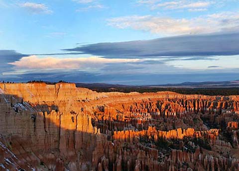 美國布萊斯峽谷國家公園 布萊斯峽谷國家公園位于美國猶他州西南部,1928年建成,面積大約為145平方公里。其名字雖有峽谷一詞,但其并非真正的峽谷,而是沿著龐沙岡特高原東面,由侵蝕而成的巨大自然露天劇場。其獨特的地理結構稱為巖柱,由風、河流里的水與冰侵蝕和湖床的沉積巖組成。位于其內的紅色、橙色與白色的巖石形成了奇特的自然景觀,因此其被譽為天然石俑的殿堂。考古研究顯示此地區最少在1萬年前已有人居住。有數千年歷史的編筐時期的阿納薩齊文化的工藝品在公園南部被發現。派尤特人在其他文明離開的同時進駐此山谷與高原附近的土地。這些美國土著主要以打獵與采集野果為生,但亦會以種植部份產物來補充食物來源。