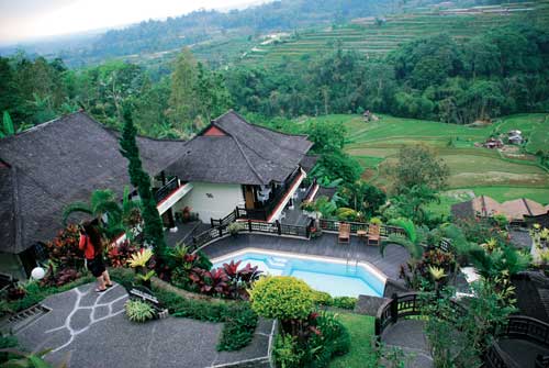 Saranam Eco-Resort 酒店可一覽梯田。 Saranam Eco-Resort 梯田盡收眼底 在巴厘島進行環島游,從海灘到山區,一路上各色風景不斷。Saranam Eco-Resort酒店位于巴厘島的中部,被群山環繞著,有點像世外桃源中的世外桃源。這里所欣賞到的風景在中國的很多地區都可以見到,但對于西方客人來說可是難得一見。這“奇妙”的景觀就是梯田,“藍眼睛”們總是奇怪于為何要把田地搞成一層一層的。酒店坐落在半山腰,35個小別墅分別位于山腰的不同高度,而房間價格也因房子的硬件設施以及所能欣賞到的風光而略有差異,從35至125美金不等。酒店的餐廳相對于房間來說占據了一個最高點,坐在餐廳里俯瞰,除了能欣賞到大片梯田外,那些點綴在山間的小別墅一覽無遺。