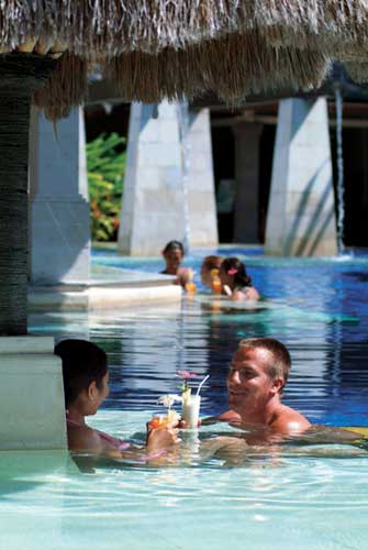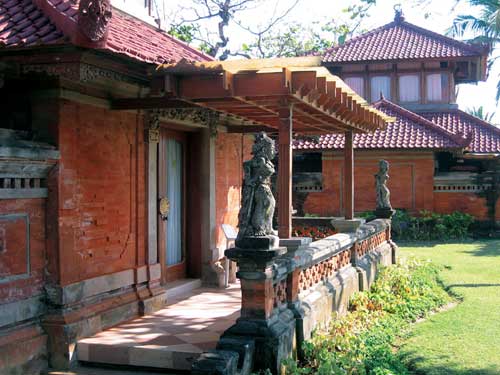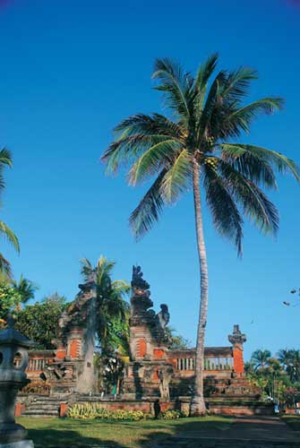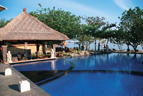 Nusa Dua (努沙杜瓦) 高檔酒店區 Nusa Dua是巴厘島國際大型豪華酒店的聚集區,位于島的南部;由于距離機場比較近,因而也成了不少游客到巴厘島后度過“銷魂第一夜”的地方。就像我這次,抵達巴厘島首府登巴薩時天色已黑,汽車以不慢的速度在街頭小路穿行,四周很靜,夜很黑,路很狹窄,我全然感覺不到一個度假勝地所該具備的那些“氣質”。十幾分鐘后,進入Nusa Dua地區,情形就完全變了,這里被酒店包圍著,霓虹燈把四周也照亮了。汽車停在Inna Putri Bali(英納普瑞酒店)門前,由于天色已晚,我已顧不上欣賞這很具有地方特色酒店的模樣,進房就睡了。