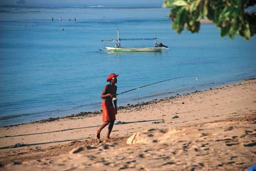 藍色的天,藍色的海,泳池里藍色的水。這里一切都是藍的。 因為靠山面海的緣故,此地能欣賞到的風光就更多元。與北京懷柔順義的那些別墅相比,這里的別墅間隔很遠,每套房都有足夠大的院子,院子里有大吊床、游泳池、花園、廚房。每套別墅分別有2至4個臥室。一個人居住一套別墅夜里可能會害怕,尤其是如果夜里有風,整夜都能聽到海浪聲。 清晨,漫步到海邊,這里的沙子不細,有很多小石子,看東邊的山,當那里漸漸變亮,太陽就要出來了。趁著清晨,趕緊登上船,可以到大海深處尋找海豚,不過能否看到全憑運氣。我們這次的運氣就很糟糕,在海上找了快一個小時,也沒發現一條海豚躍出來。通常海豚是群居動物,只要能看到就是一群。 再回到岸邊時天已大亮,此時重新打量Taman Sari villa酒店,同行的所有女孩都馬上跑回房間拿相機,因為實在太美了。我相信如果這個項目放在目前的北京房地產市場銷售,沒有50000元/平方米是下不來的。