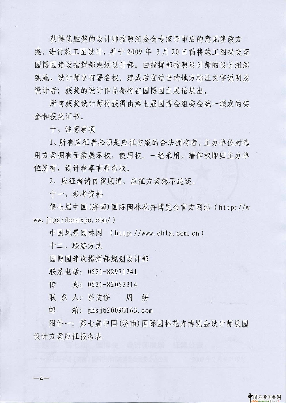 2、確認報名后,請于2009年2月25日至2009年2月28日提交展園設計方案,提交資料應包括效果圖、平面圖、重要景觀節點資料、設計說明,以上資料以電子版提交至園博園建設指揮部規劃設計部(詳見聯絡方式)。